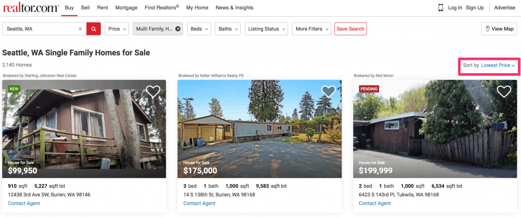See the screenshot below for an example of the Seattle market from Realtor.com. While the median sale price for a home in the Seattle area is around $650,000 (source) these properties can be found for under $150,000. Obviously this is not taking into account the condition or neighborhood, but it’s a good place to start.