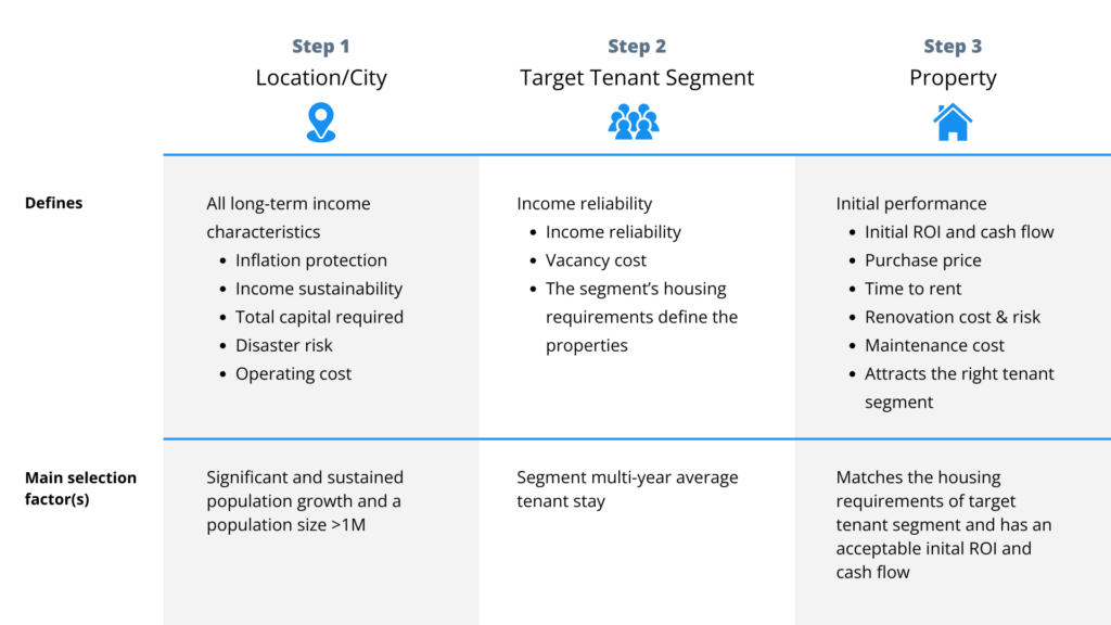 People often choose a location based on cost, cash flow, or ROI. However, cash flow and ROI metrics only predict a property’s performance under ideal conditions on the first day of a long-term hold. You need to take a much longer view than just the first day.