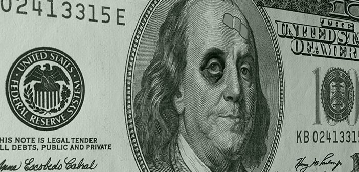 Ben Franklin with sports a shiner (black eye) and a band-aid on the face of a US One Hundred Dollar Bill (C-Note) as an illustration of the weak dollar.
