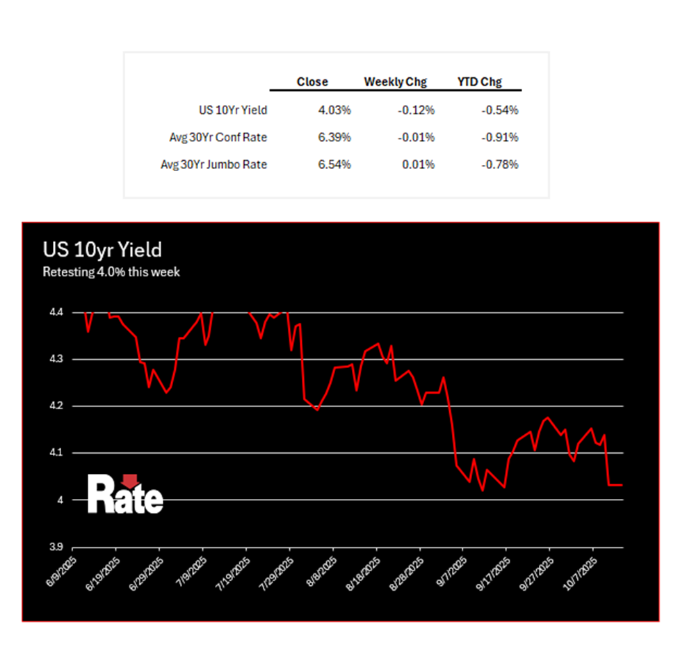 Now entering its third week, the federal government shutdown has paralyzed the release of critical economic data. The September CPI report has been postponed, and the jobs report remains unscheduled. This data blackout has left markets and the Fed flying blind, amplifying the impact of private-sector indicators like ADP's weak employment numbers. The result: a muted but persistent downward drift in rates. Agencies like the IRS and FHA are operating at reduced capacity, but core mortgage operations remain functional. With no clear end in sight, the shutdown is reinforcing the market's dovish bias and delaying any potential tightening moves from the Fed. Until the data resumes, expect rates to remain under pressure.