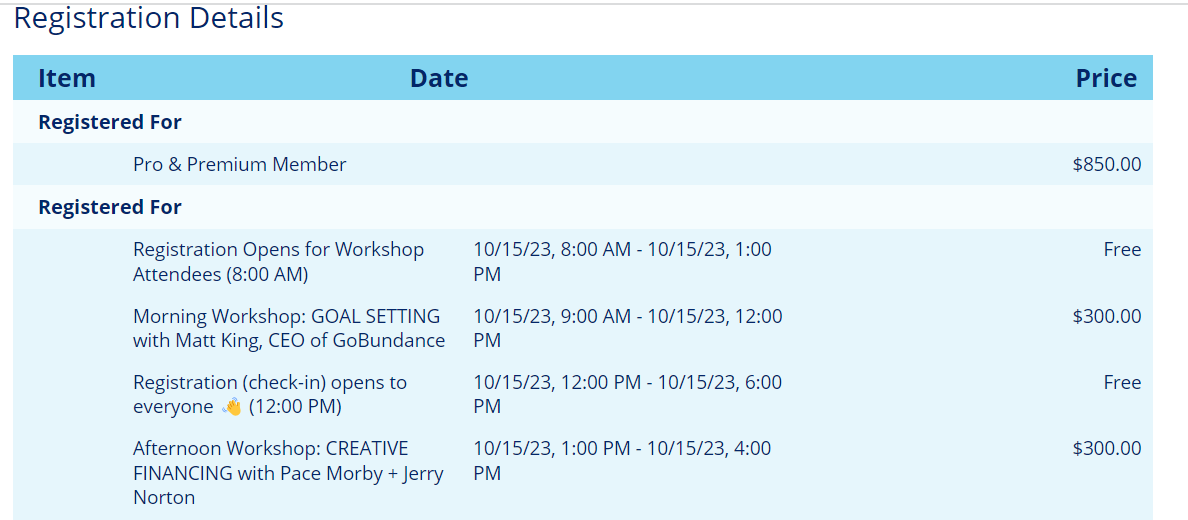 Hello! I am no longer able to attend the conference coming up. I am selling my ticket. I also paid for the Goal Setting and Creative Financing workshops if anyone is interested in those two as well.