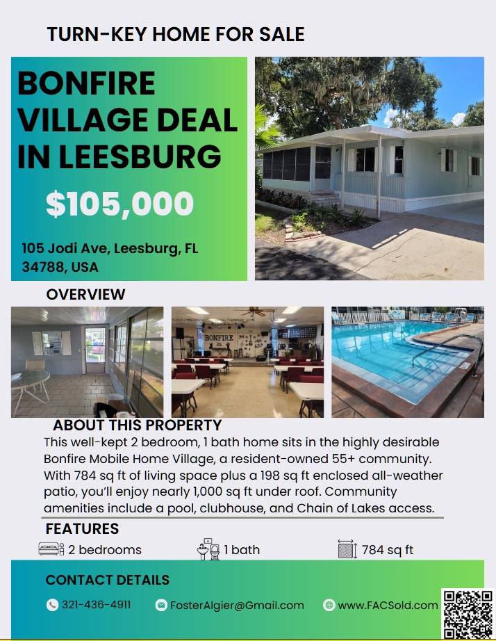 Tucked away in Leesburg’s Bonfire community (55+), this 2-bed, 1-bath home is the perfect cozy retreat. The enclosed all-weather patio and proximity to lakes and rivers adds flexible space to relax or entertain.