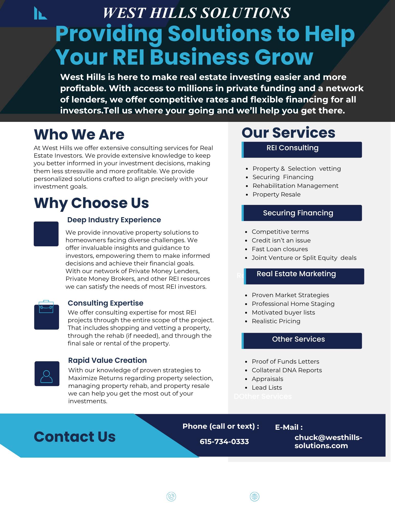 I would like to share some of the financing options West Hills Solutions offers for Real Estate Investors. We’re a nationwide private money lender.