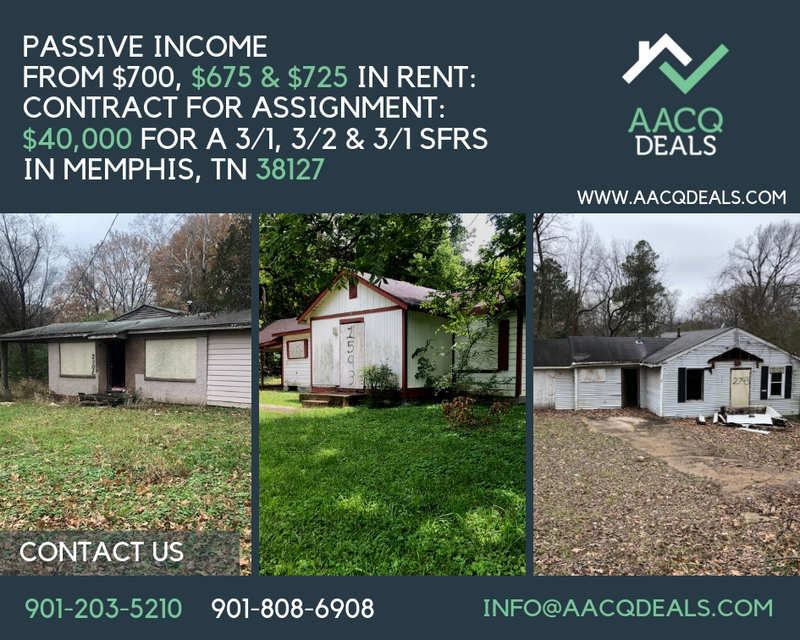 PASSIVE INCOME from $700, $675 & $725 in Rent: Contract for Assignment: $40,000 for a 3/1, 3/2 & 3/1 SFRs in Memphis, TN 38127