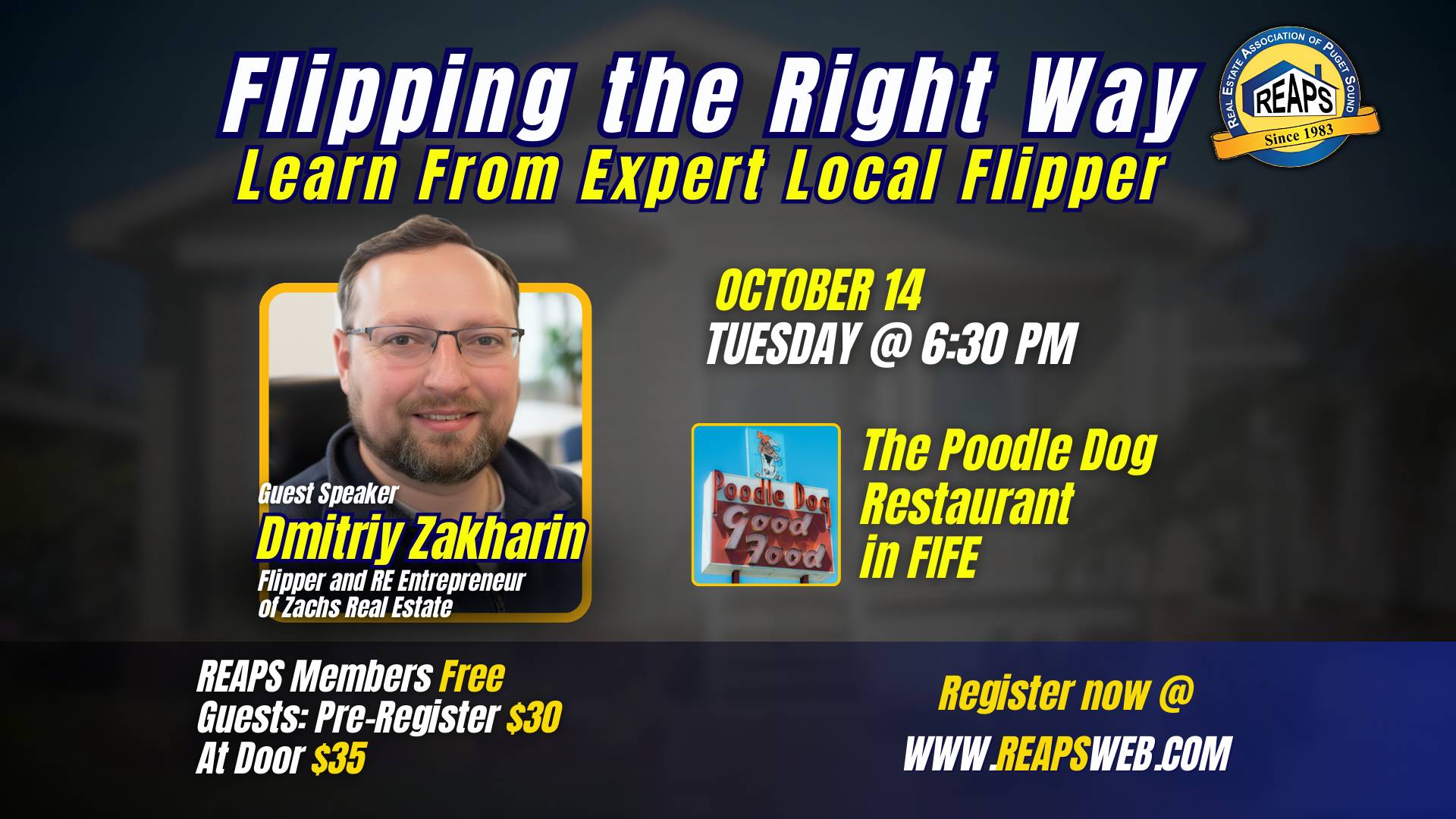 Our guest speaker, Dmitriy Zakharin, a seasoned Flipper and RE Entrepreneur of Zachs Real Estate, will share his valuable insights and strategies for successful property flipping. Whether you're a seasoned investor or just starting out, this is a can't-miss opportunity to learn from a local expert.