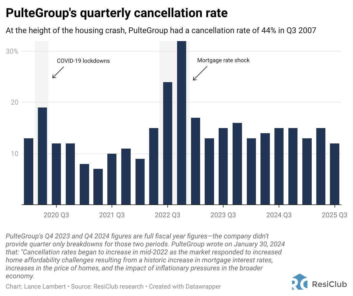 - 2-No, cancellations of home purchases are not concerning. At the height of the housing crash, PulteGroup had a cancellation rate of 44% in Q3 2007 PulteGroup’s cancellation rate this quarter was 12% (ResiClub).