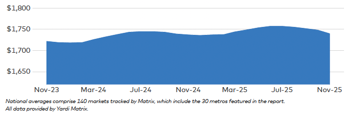 Advertised rents for multifamily apartments dropped $8 in November to $1,740, marking the fourth straight month of declines. That’s a $17 haircut from the summer high. YOY was still positive, but growth scraped by at 0.2%—the lowest growth since Q1 2021, when post-pandemic stagnation set in.