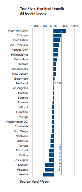 Top YOY performers: New York (5.7%), Chicago (3.8%), Twin Cities (3.2%). Bottom: Austin, Phoenix, Denver.