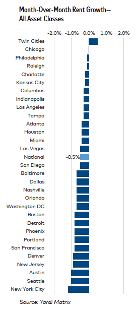 Yes, multifamily’s in a very soft patch. Supply’s overwhelming demand, and YoY growth at 0.2% is anemic. Top performers like NYC (5.7%) and Chicago (3.8%) are outliers—coastal stability, sure, but even they dipped MoM.