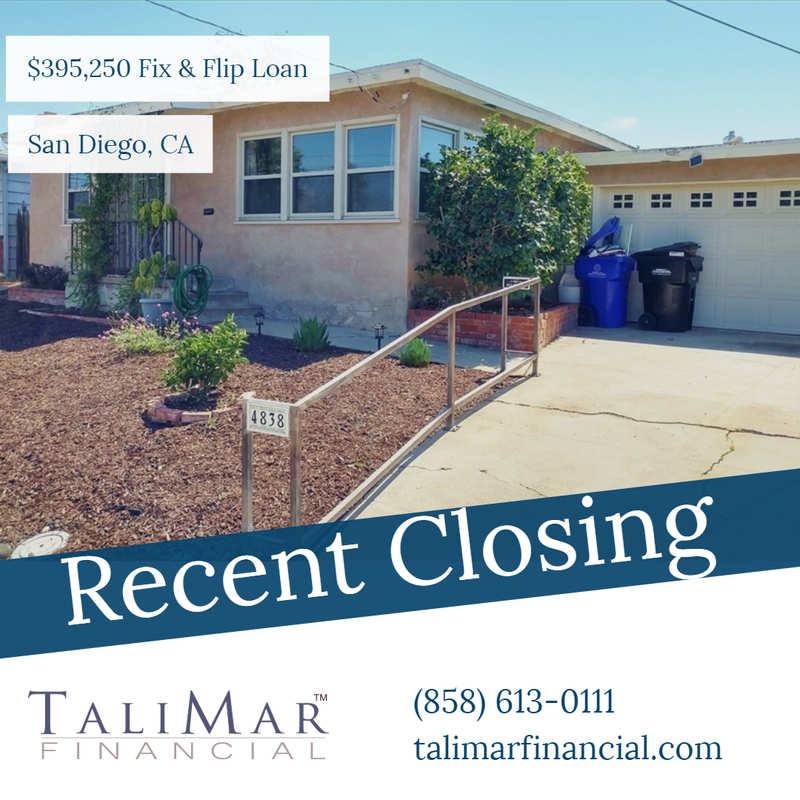 TaliMar Financial is pleased to announce its most recent funding of a $395,500 Fix & Flip loan secured on a single family home in San Diego, CA.