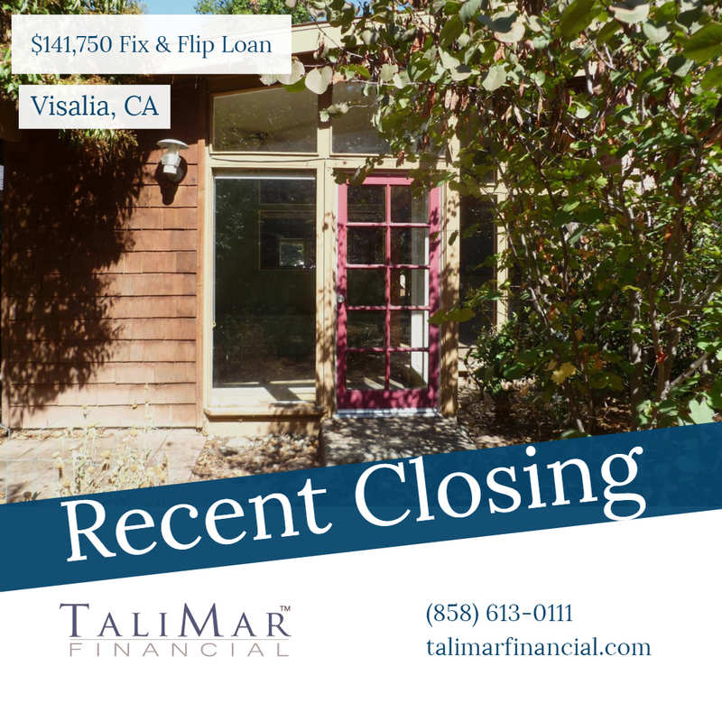 Visalia, CA - TaliMar Financial is pleased to announce its recent funding of a $141,750 Fix & Flip loan secured on a single family home located in Visalia, CA. The Borrower intends to cosmetically update the Subject property prior to listing it for sale.