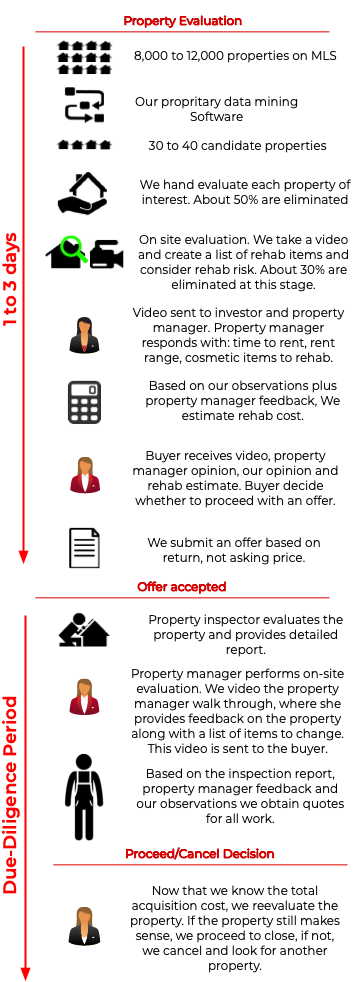 On "buying property unseen", not the way our process works. We are engineers and believe in processes. Documented repeatable processes enable us to reduce errors and inefficiencies. Below is a visual representation of our process from raw MLS data through the end of the due-diligence period.