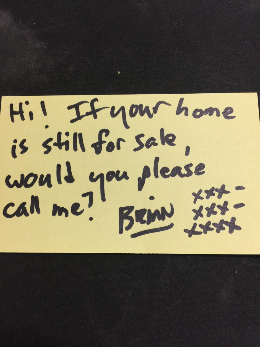 If an owner is not home and no one answers, I will put a yellow sticky note on the door. I'll use a medium black sharpie pen, and I'll write something like,